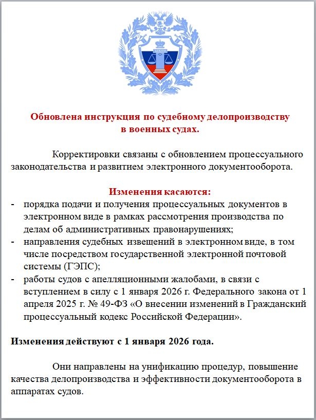 Изменения в Инструкции по делопроизводству в военных судах с 01.01.2026версия для печати